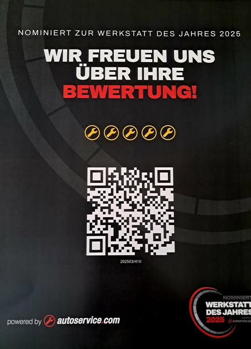 Wir sind zur "Werkstatt des Jahres 2025" nominiert und nun auf Ihre Unterstützung angewiesen. Bitte bewerten Sie uns... QR-Code einscannen oder auf folgenden Link klicken: https://www.autoservice.com/werkstatt-des-jahres/qr/202503/410 und es kann losgehen... Hierbei ist zu erwähnen, dass 5 Schraubenschlüssel die bestmögliche Bewertung ist.